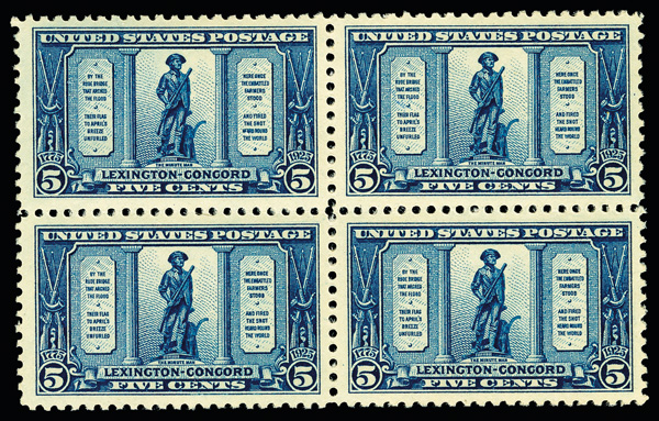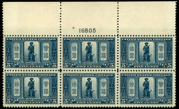 5231 nhbl 619 image1925, 5¢ Lexington-Concord (Scott 619), top margin F plate block of 6, Beautiful clean freshness, bottom stamps well centered, o.g., never hinged, Very Fine.