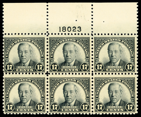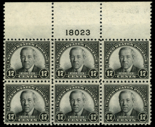 5237 nh/ogbl 623 image1925, 17¢ Wilson (Scott 623), top margin plate block of 6, Brilliant and radiant look, o.g., lightly hinged (5 stamps never hinged), Fine to Very Fine.