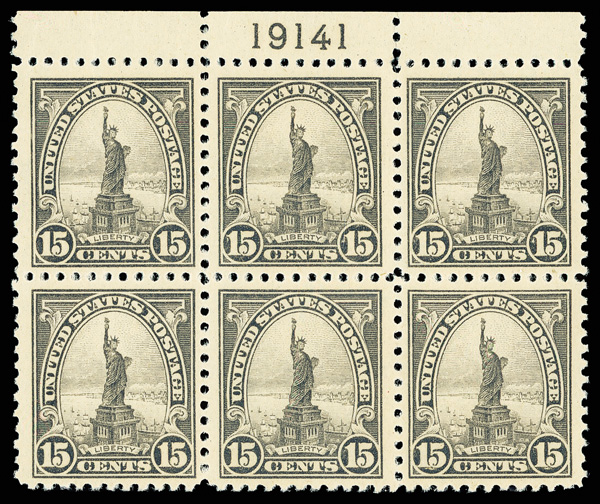 5204 nhbl 566 image1922, 15¢ Statue of Liberty (Scott 566), top margin plate block of 6 with plate number 19141, Bright, naturally vivid tone, o.g., never hinged; light wrinkle on top left stamp, Very Fine.