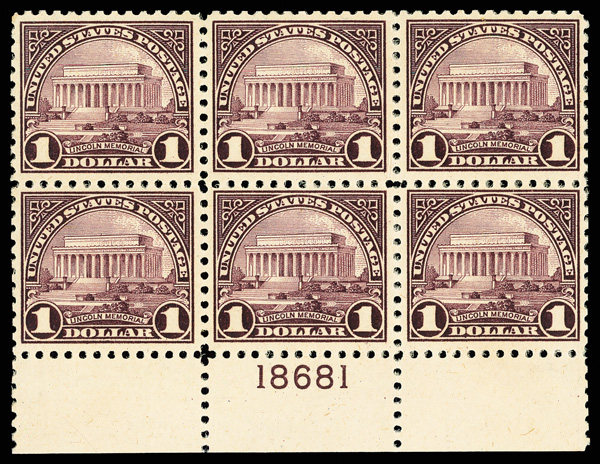 5212 nhbl 571 image1923, $1 Lincoln Memorial (Scott 571), bottom margin plate block of 6 with plate number 18681, Fresh and vivid overall look, o.g., never hinged, Fine to Very Fine.