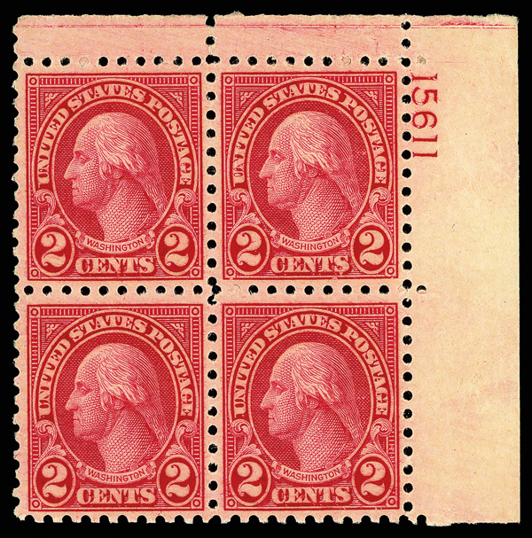 5219 nhbl 583 image1924, 2¢ Washington, rotary press printing, perf. 10 (Scott 583), top right plate block of 4 with plate number 15611, Fresh tone with pure brightness, o.g., never hinged, Fine to Very Fine.