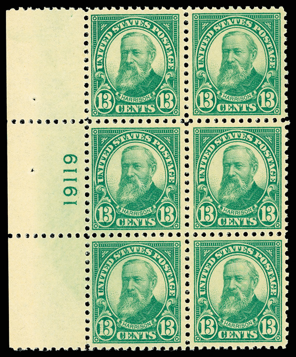 5234 nhbl 622 image1926, 13¢ Harrison (Scott 622), left margin plate block of 6 with plate number 19119, Clear vibrant ink presence, o.g., never hinged; minor gum skips, Very Fine to Extremely Fine.