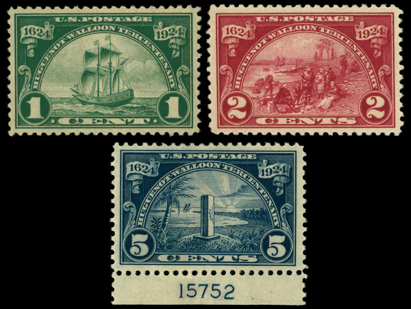 5225 nh 614-616 image1924, Huguenot-Walloon complete (Scott 614-616), set of 3, 5¢ plate number single, o.g., never hinged, Extremely Fine.
