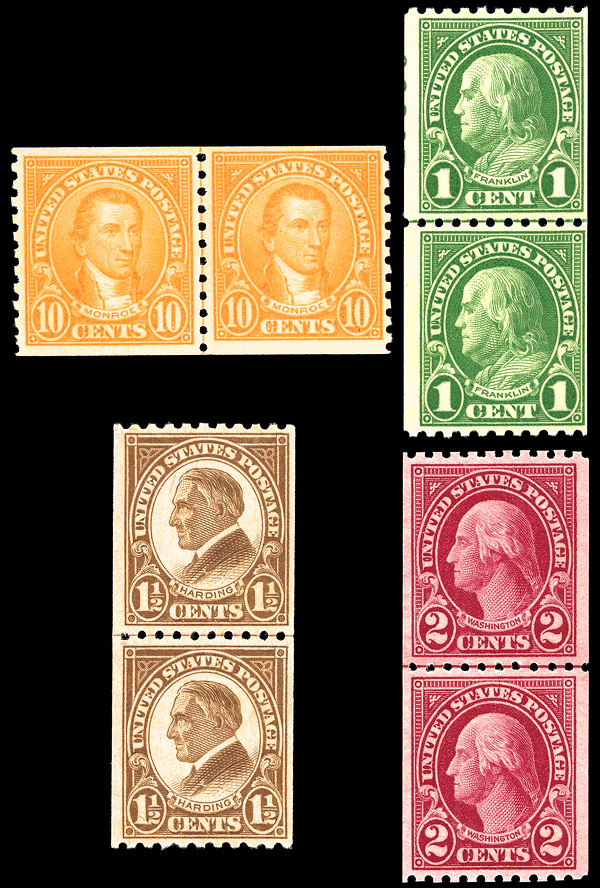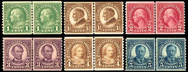 5222 og 597-599, 600-606 image1923-25, 1¢-10¢ Regular Issue Coils (Scott 597-599, 600-606), joint line pairs, o.g., hinged (2¢, 4¢ 5¢ & 10¢ NH), Fine to Very Fine.