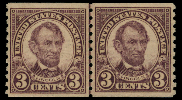 5223 nh 600 image1924, 3¢ Lincoln, rotary press coil, perf. 10 vertically (Scott 600), joint line pair, o.g., never hinged, Fine to Very Fine.