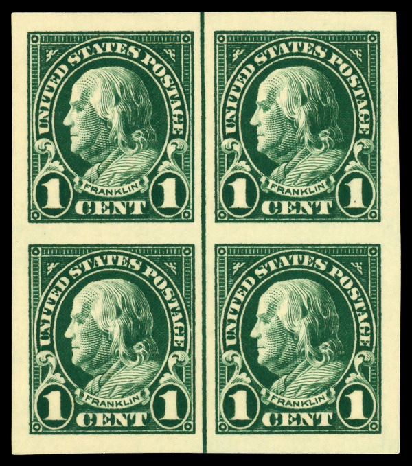 5215 nhbl 575 image1923, 1¢ Franklin, imperf. (Scott 575), block of 4 with vertical guide line, o.g., never hinged, Extremely Fine to Superb.