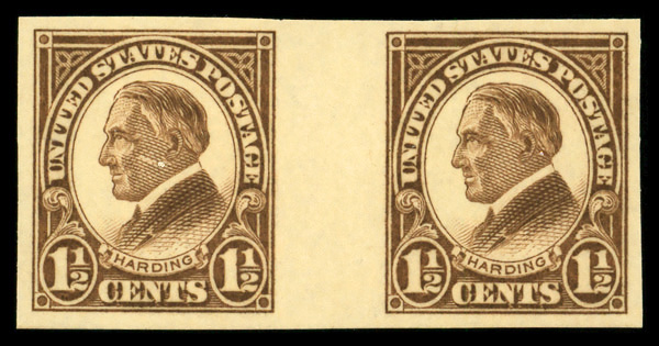 5239 nh 631 image1926, 1½¢ Harding, rotary press printing, imperf., without gum breaker ridges (Scott 631), horizontal pair with gutter between, o.g., never hinged, Very Fine to Extremely Fine.