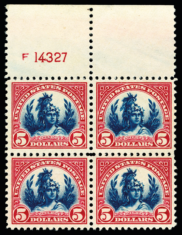 5214 nhbl 573 image1923, $5 America (Scott 573), block of 4 with plate number F 14327, Radiant color, o.g., never hinged, Fine to Very Fine.