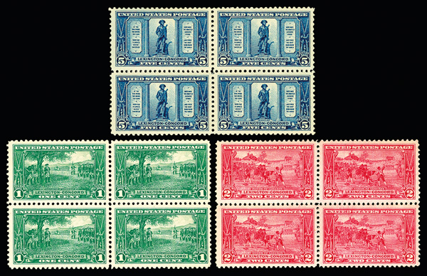 5229 nhbl 617-619 image1925, Lexington-Concord complete (Scott 617-619), set of 3, block of 4, Wonderfully bright tone, o.g., never hinged, Very Fine.