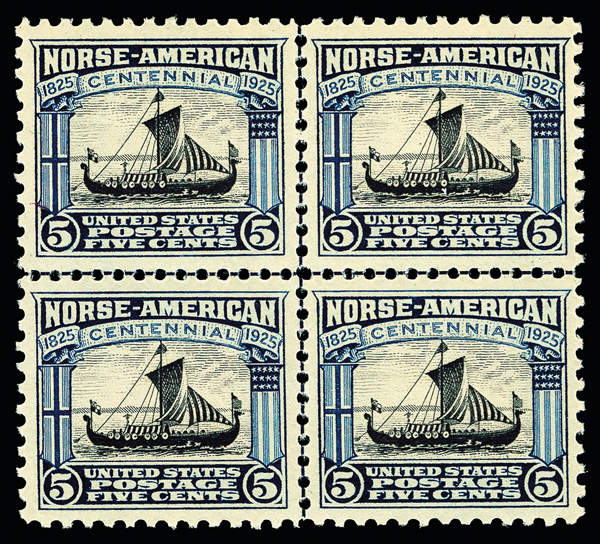 5233 nhbl 621 image1925, 5¢ Norse-American (Scott 621), centerline block of 4, Immaculate appearance, o.g., never hinged, Very Fine to Extremely Fine.