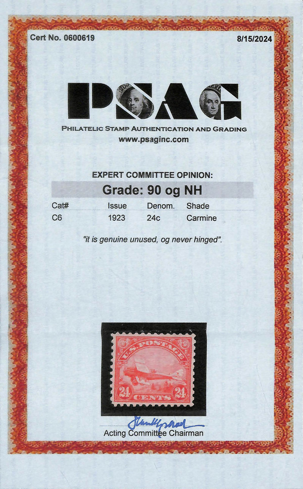 5344 og C6 imageAirmail, 1923, 24¢ carmine (Scott C6), o.g., very lightly hinged since certification, Extremely Fine, with 2024 P.S.A.G. certificate graded XF 90.
