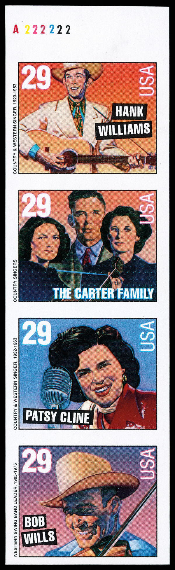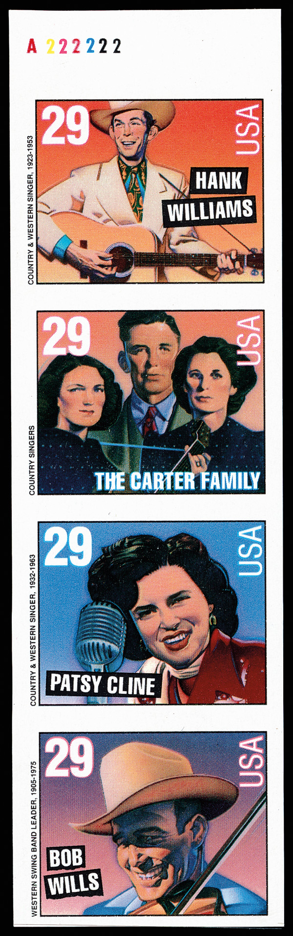 5333 BKP 2778aP var. image1993, 29¢ American Music, proof pane of 4, imperforate (Scott 2778aP var.), with plate no. A22222, o.g., never hinged, Very Fine. (Image) Suggested Bid $195
