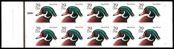 5326 BKnh 2484g image1991, 29¢ Wood Duck, black "29 USA", booklet pane of 10, imperf between (Scott 2484g), complete unexploded booklet with both panes the error, each pane with straight edge at top and full perforations at bottom; fresh, o.g., never hinged, Very Fine.