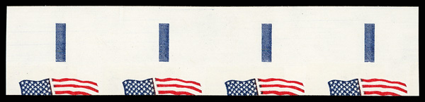 5323 nh 2115f var. image1985, 22¢ Flag over Capitol Dome, horizontal coil, imperforate pair, wide block tagging, Electric Eye bars (Scott 2115f var.), two pairs in strip of four, miscut showing approximately one-half of flag and full bars in top selvage, o.g., never hinged, pristine and sharp, Very Fine. (Image) Suggested Bid $130