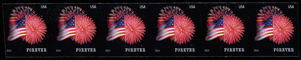 5334 nh 4868b image2014 (49¢) (forever) Fort McHenry Flag and Fireworks, pair, die cutting omitted (Scott 4868b), three pairs in strip of six, o.g., never hinged, sound and bright, Very Fine. (Image) Suggested Bid $195