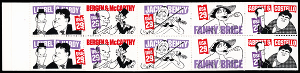 5330 BKnh 2566b var. image1991, 29¢ Comedians, booklet pane of 10, scarlet and bright violet (engraved) shifted (Scott 2566b var.), on top pane in booklet covers, the three remaining stamps (bottom Laurel & Hardy to Benny) of the second pane normal, o.g., never hinged, sound and fresh, Very Fine. (Image) Suggested Bid $195