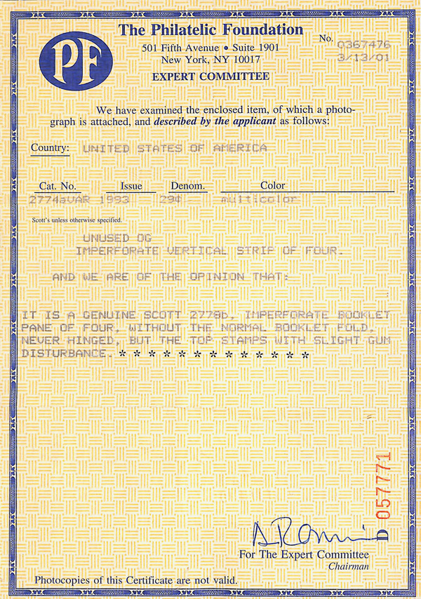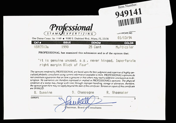 5327 P 2513P3 image1990, 25¢ Eisenhower (Scott 2513P3), right margin horizontal pair, o.g., never hinged, Extremely Fine, with 1994 P.S.E. photo certificate for block.
