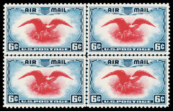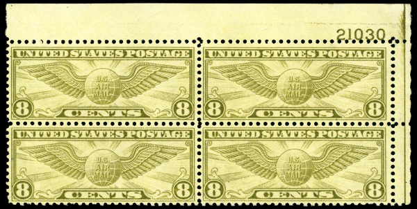 5355 nhbl C17 imageAirmail, 1932, 8¢ Winged Globe (Scott C17), plate block of 4, o.g., never hinged, Very Fine.