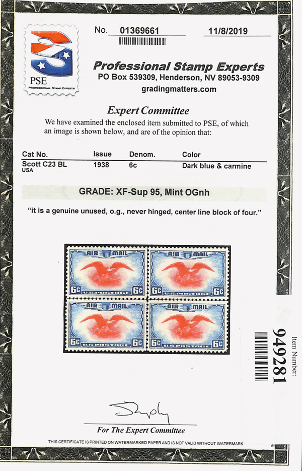 5360 nhbl C23 imageAirmail, 1938, 6¢ Eagle (Scott C23), centerline block of 4, o.g., never hinged, Extremely Fine to Superb, with 2019 P.S.E. certificate graded XF-SUP 95 for block.