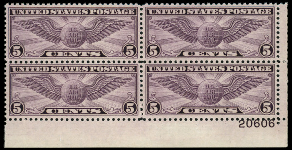 5354 nhbl C16 imageAirmail, 1931, 5¢ Winged Globe, rotary press printing (Scott C16), bottom right plate block of 4, Vibrant impression, o.g., never hinged, Very Fine to Extremely Fine.