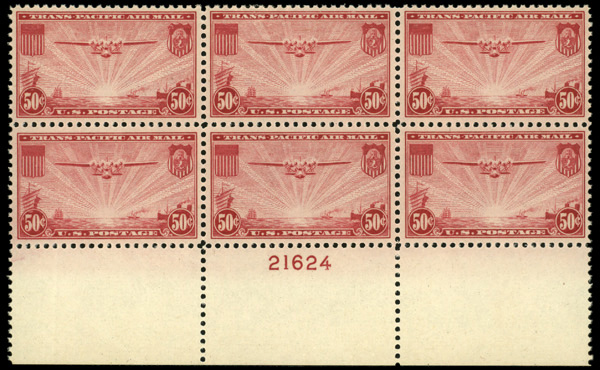 5359 nhbl C22 imageAirmail, 1937, 50¢ China Clipper (Scott C22), bottom margin plate block of 6, Gorgeous lively detail, o.g., never hinged, Very Fine to Extremely Fine.