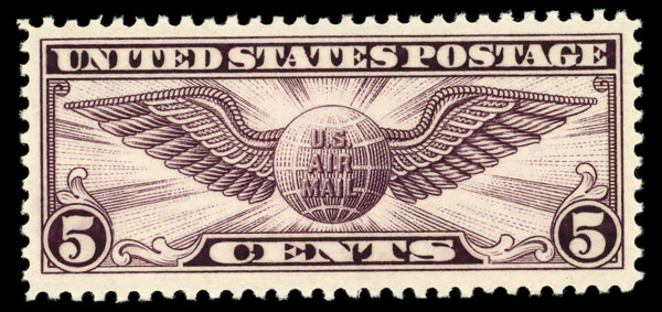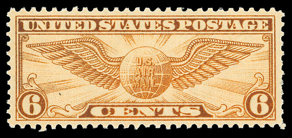 5357 nh C19 imageAirmail, 1934, 6¢ Winged Globe (Scott C19), o.g., never hinged, exquisitely centered; color slightly dulled, small inclusion at lower left, otherwise Extremely Fine. (Image) Suggested Bid $32