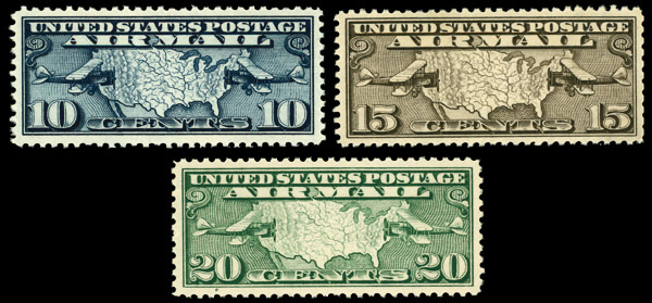 5346 nh C7-C9 imageAirmail, 1926-27, Map & Planes complete (Scott C7-C9), set of 3, o.g., never hinged, Extremely Fine.