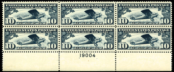 5350 nhbl C10 imageAirmail, 1927, 10¢ Lindbergh (Scott C10), plate block of 6, o.g., never hinged, Very Fine to Extremely Fine.
