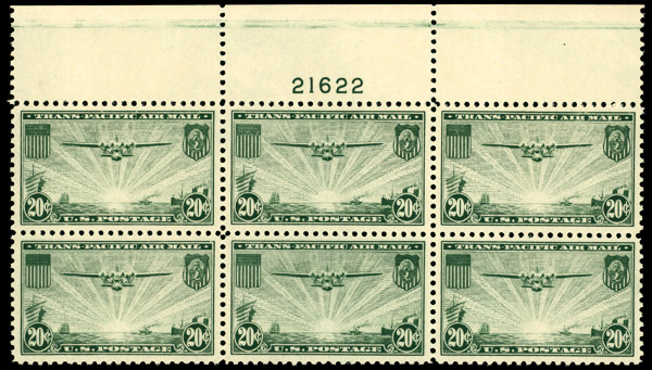 5358 nhbl C21 imageAirmail, 1937, 20¢ China Clipper (Scott C21), plate block of 6, o.g., never hinged (gum skip), Extremely Fine.