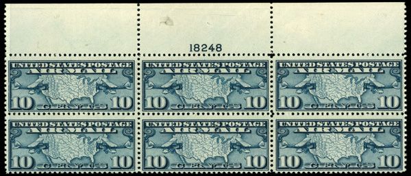 5347 nhbl C7 imageAirmail, 1926, 10¢ Map & Planes (Scott C7), plate block of 6, o.g., never hinged (gum skips), Fine to Very Fine.