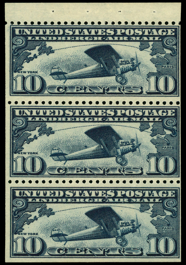 5351 BKog C10a imageAirmail, 1928, 10¢ Lindbergh, booklet pane of 3 (Scott C10a), o.g., lightly hinged, Fine.