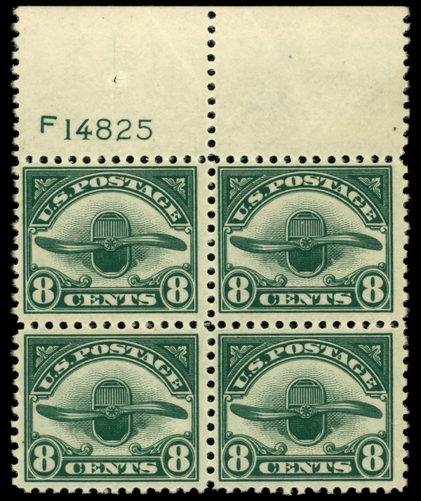 5341 nhbl C4 imageAirmail, 1923, 8¢ dark green (Scott C4), top margin block of 4 with plate number, o.g., never hinged, Fine.