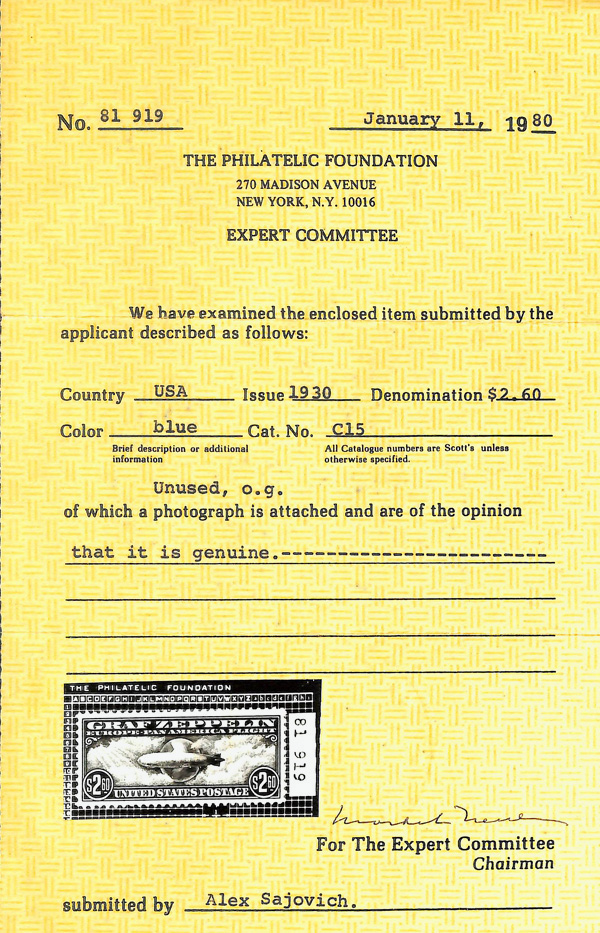 5353 nh C15 imageAirmail, 1930, $2.60 Graf Zeppelin (Scott C15), o.g., never hinged (minor gum skips), Very Fine to Extremely Fine, with 1980 P.F. certificate.