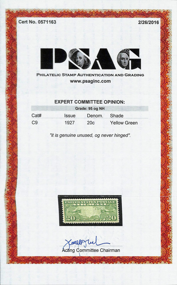 5348 nh C9 imageAirmail, 1927, 20¢ Map & Planes (Scott C9), o.g., never hinged, Extremely Fine to Superb, with 2016 P.S.A.G. certificate graded XF-SUP 95.