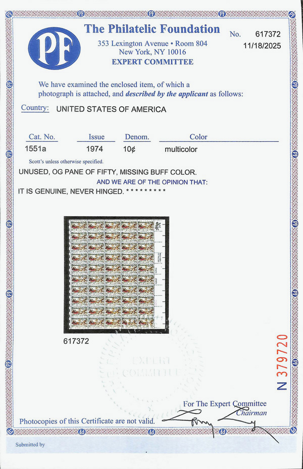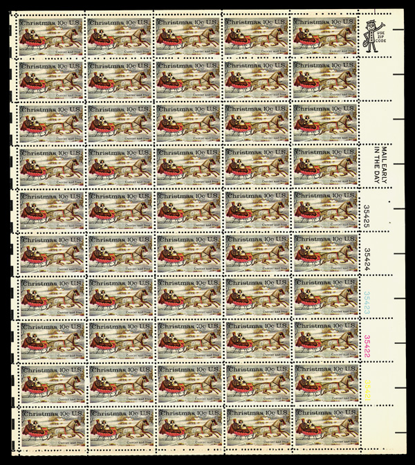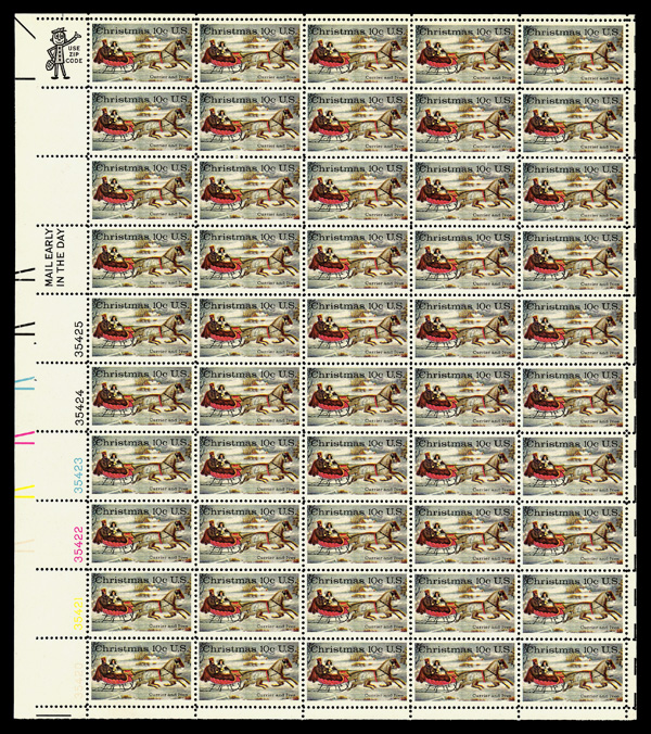 5322 nhbl 1551a image1974, 10¢ Christmas: Currier and Ives, buff omitted (Scott 1551a), pane of 50, with normal example, o.g., never hinged, Fine to Very Fine, with 2025 P.F. certificate.