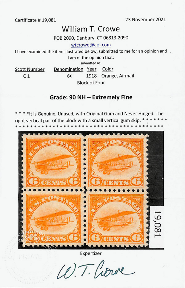 5336 nhbl C1 imageAirmail, 1918, 6¢ orange (Scott C1), block of 4, Brand-new appearance, o.g., never hinged; small vertical gum skip along right stamps, Extremely Fine, with 2021 Crowe certificate graded XF 90.