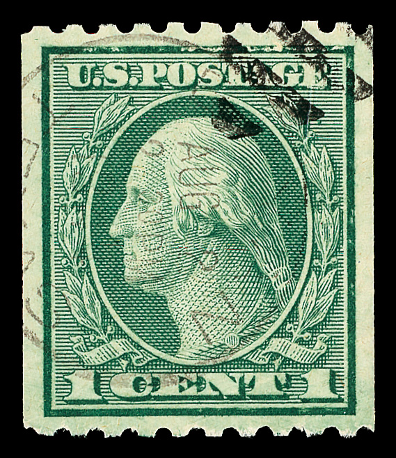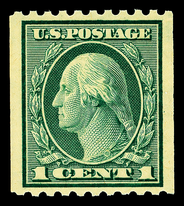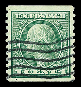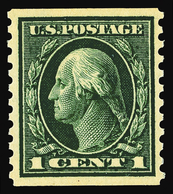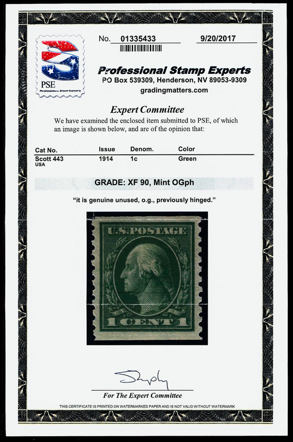 7202 og 443 image1914, 1¢ green, S.L. watermark, flat plate coil, perf. 10 vertically (Scott 443), o.g., invisibly hinged, Extremely Fine, with 2017 P.S.E. certificate graded XF 90.