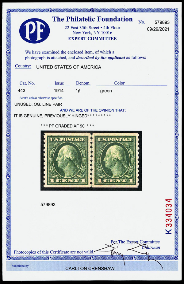 7201 og 443 image1914, 1¢ green, S.L. watermark, flat plate coil, perf. 10 vertically (Scott 443), guide line pair, o.g., lightly hinged, Extremely Fine, with 2021 P.F. certificate graded XF 90.