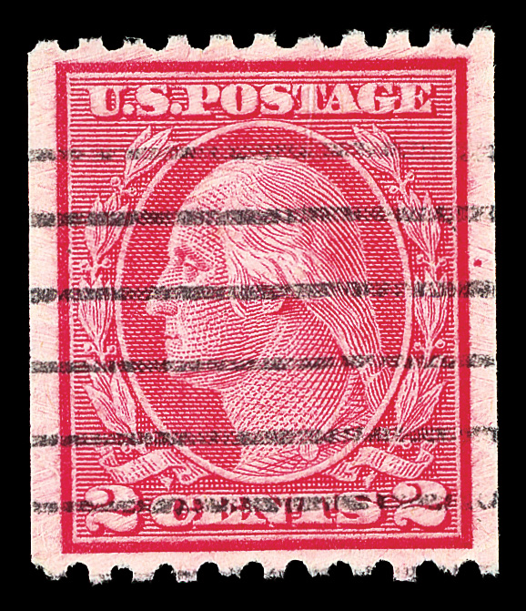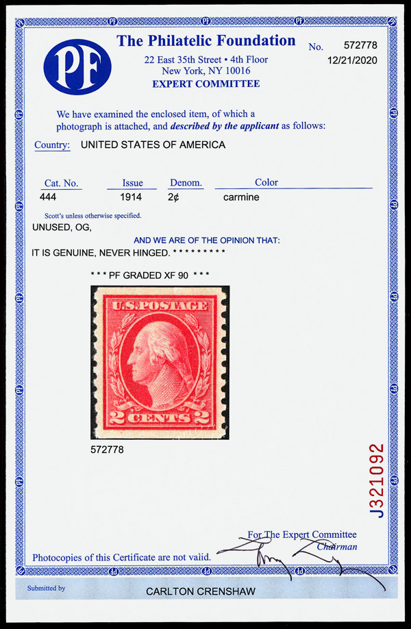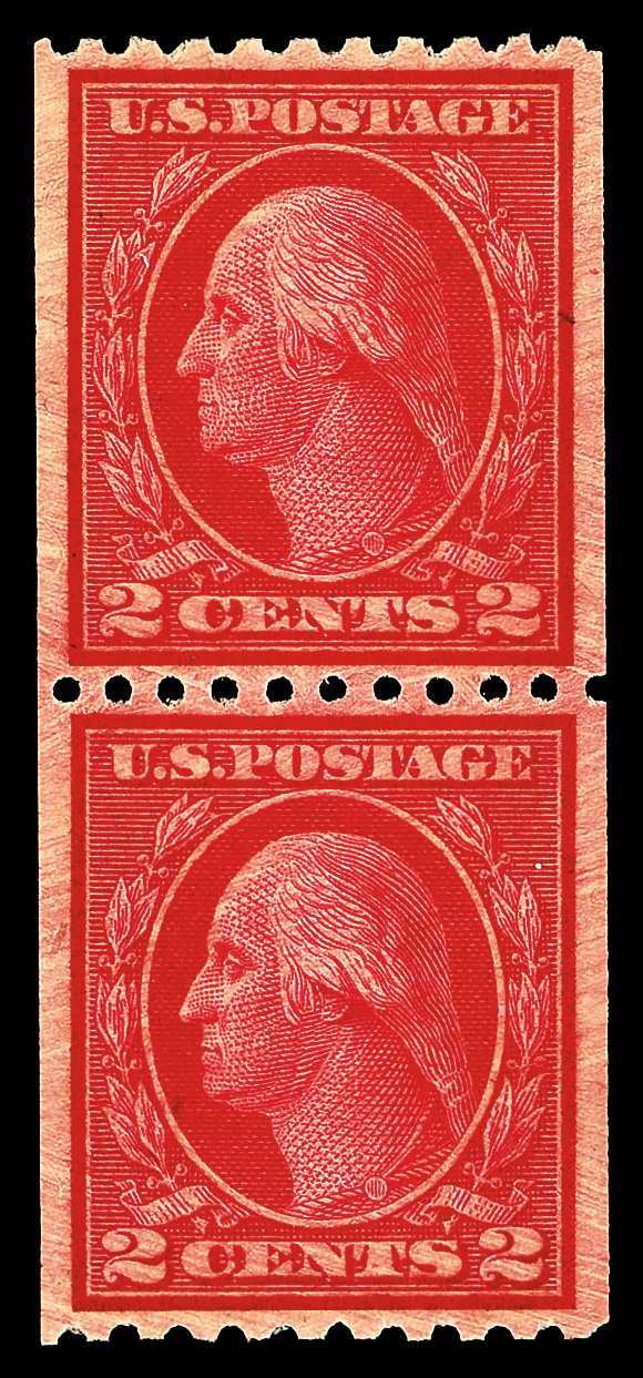 7203 nh 444 image1914, 2¢ carmine, type I, S.L. watermark, flat plate coil, perf. 10 vertically (Scott 444), o.g., never hinged, Extremely Fine, with 2020 P.F. certificate graded XF 90.