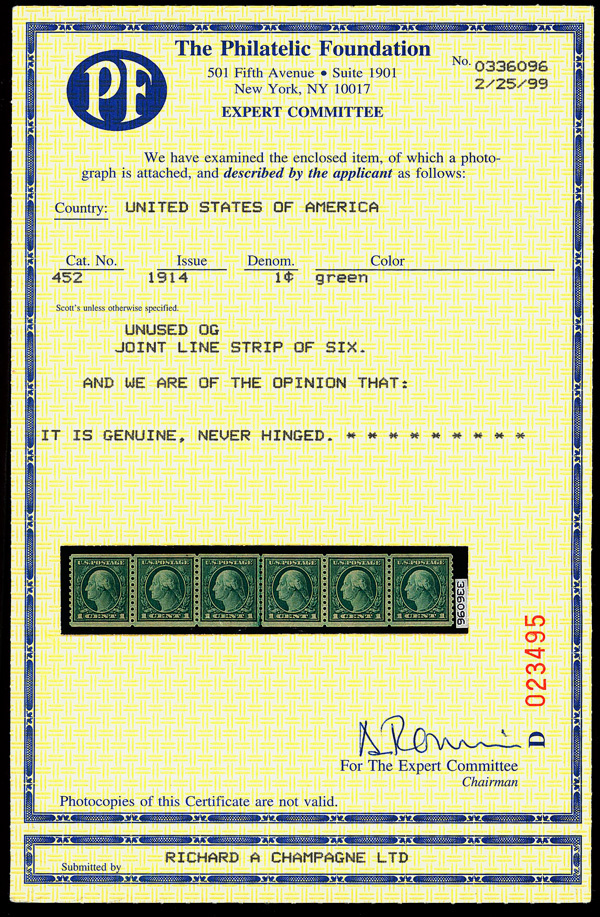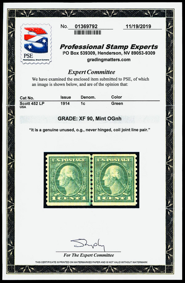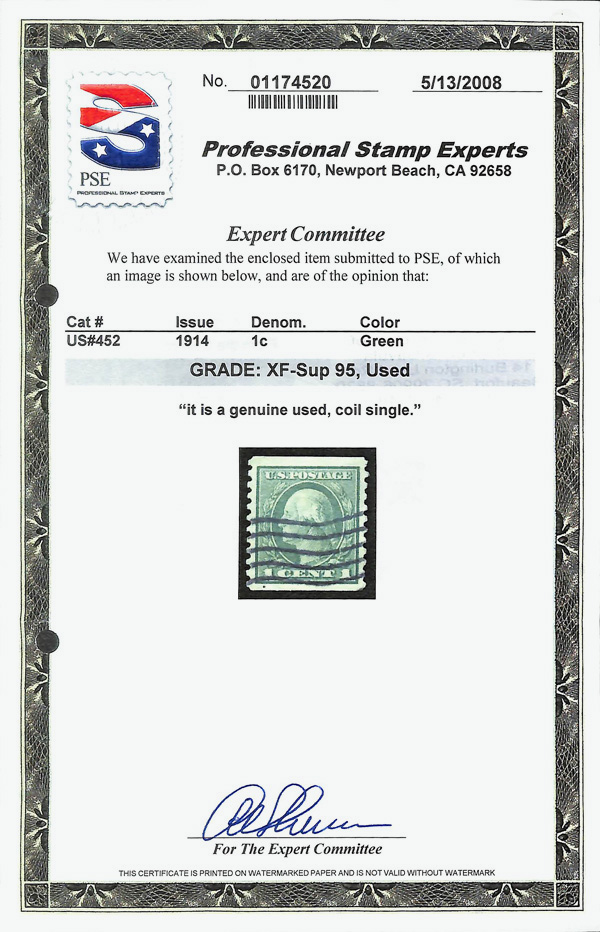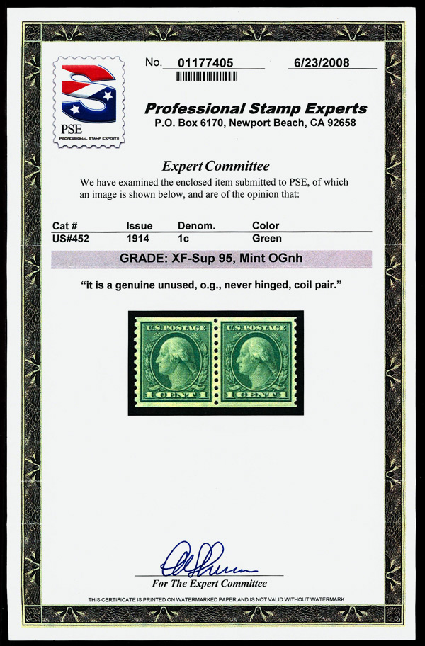 7207 O 452 image1914, 1¢ green, S.L. watermark, rotary press coil, perf. 10 vertically (Scott 452), Extremely Fine to Superb, with 2008 P.S.E. certificate graded XF-SUP 95.