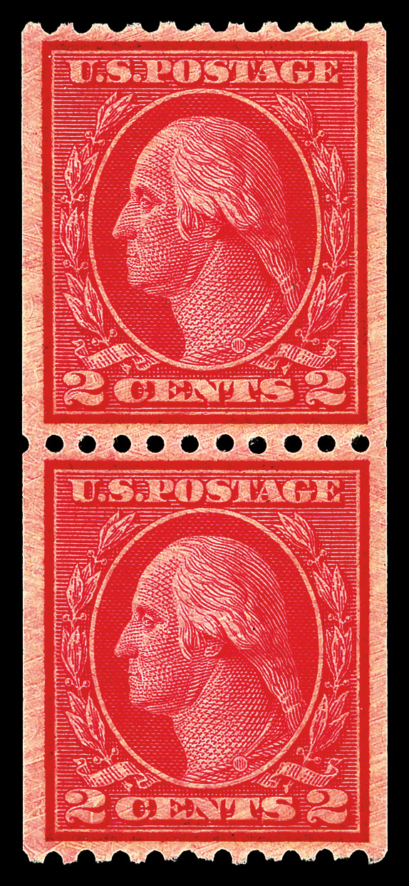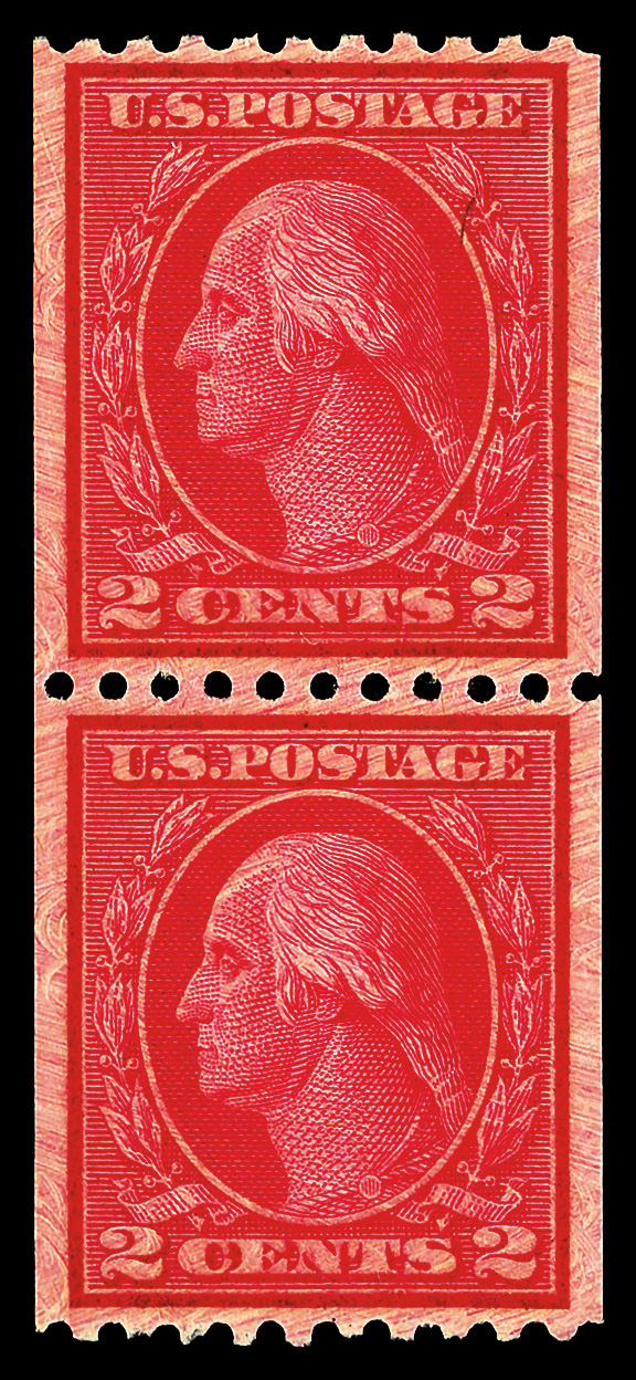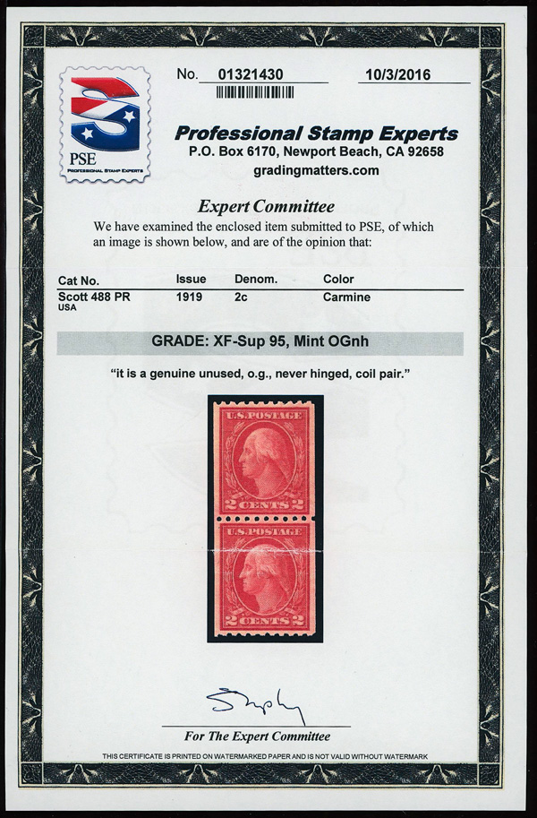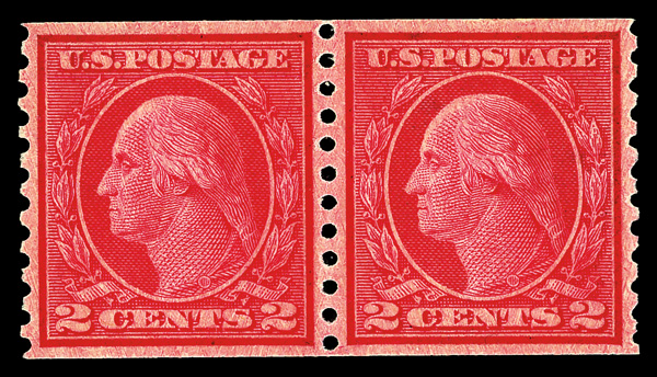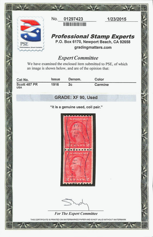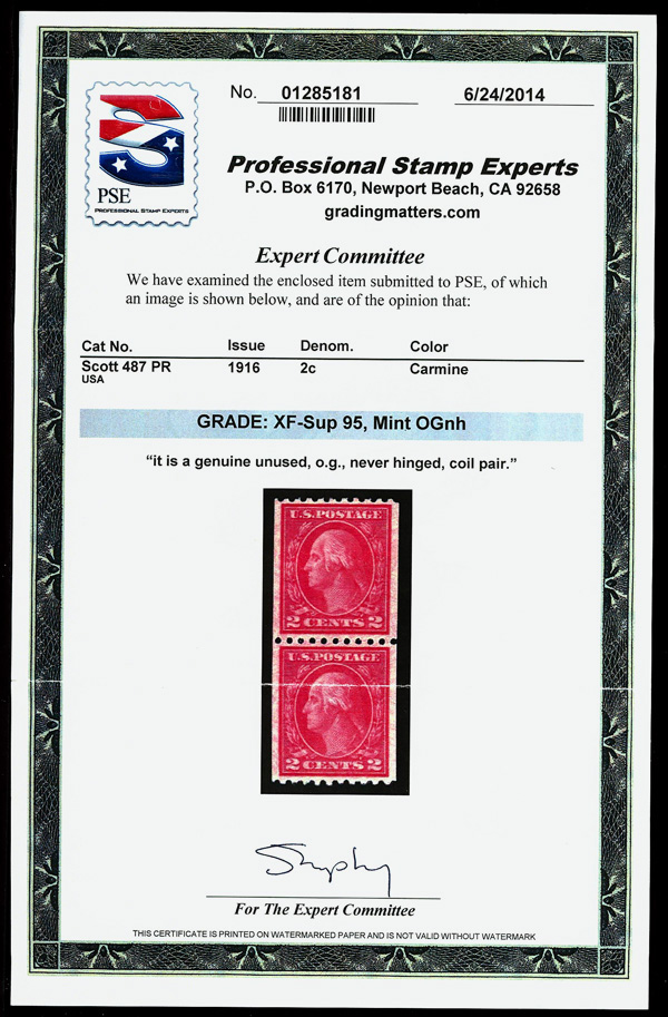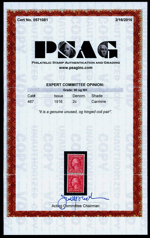 7237 og 487 image1916, 2¢ carmine, type II, unwatermarked, rotary press coil, perf. 10 horizontally (Scott 487), pair, o.g., invisibly hinged, Extremely Fine, with 2016 P.S.A.G. certificate graded XF 90.