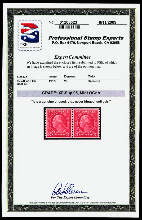 7209 nh 455 image1915, 2¢ carmine, type III, S.L. watermark, rotary press coil, perf. 10 vertically (Scott 455), pair, o.g., never hinged, Extremely Fine to Superb, with 2009 P.S.E. certificate graded XF-SUP 95.