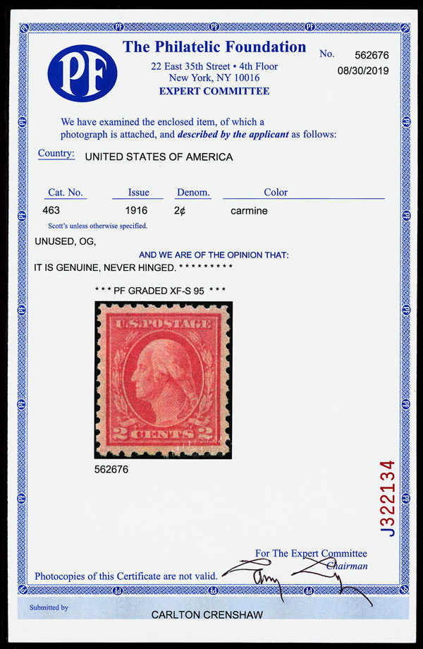 7212 nh 463 image1916, 2¢ carmine, type I, unwatermarked, perf. 10 (Scott 463), o.g., never hinged, Extremely Fine to Superb, with 2019 P.F. certificate graded XF-SUP 95.
