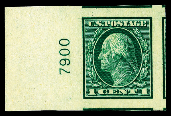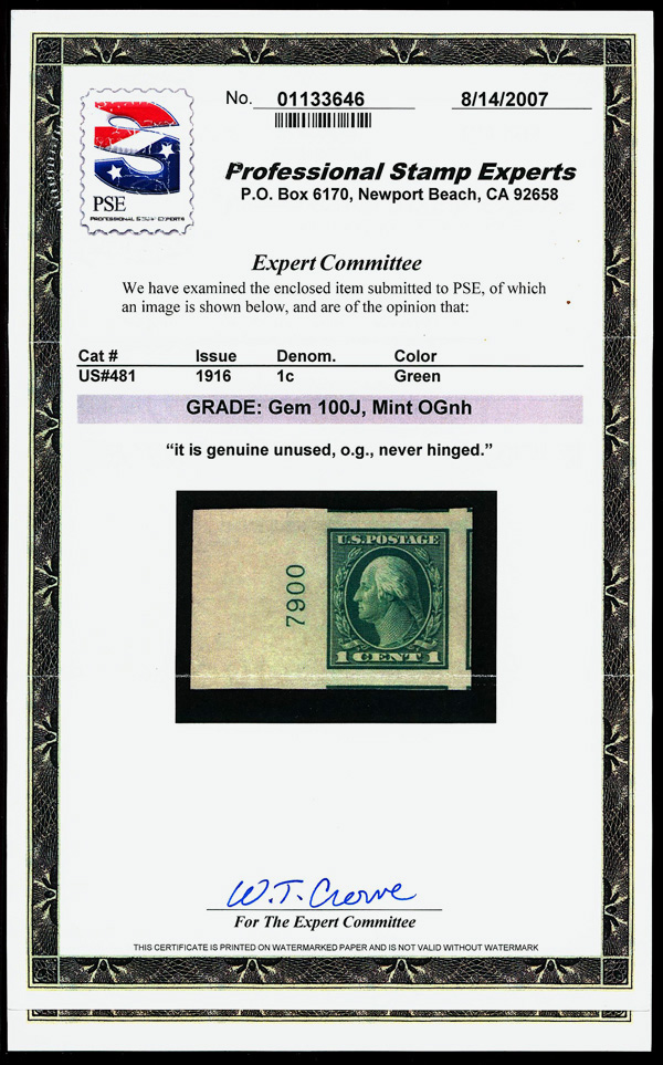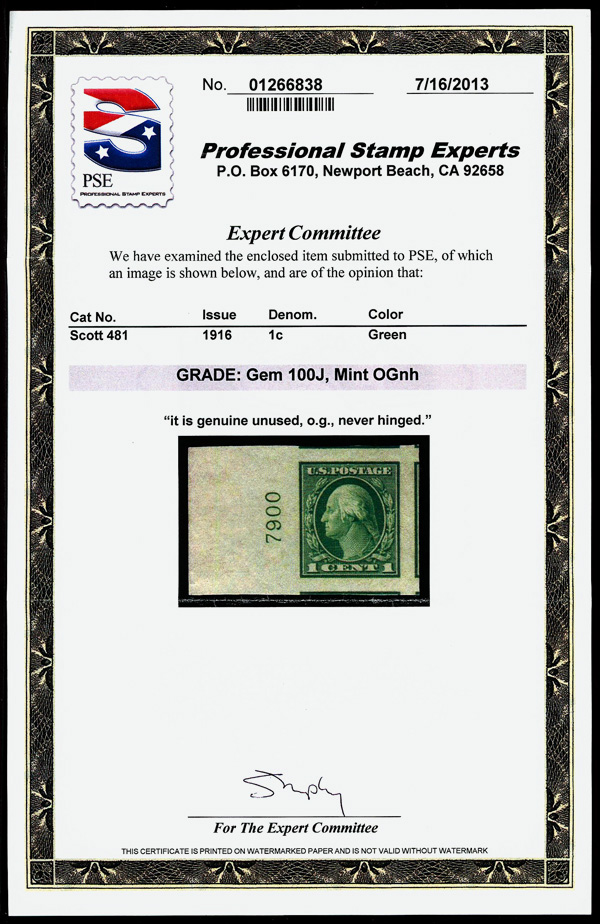 7225 nh 481 image1916, 1¢ green, unwatermarked, imperf. (Scott 481), plate number single, o.g., never hinged, jumbo margins with small parts of 5 surrounding stamps, Superb no SMQ price for GEM 100J, with 2007 P.S.E. certificate graded GEM 100J. (Image) (Image2) (Image3) (All Images)