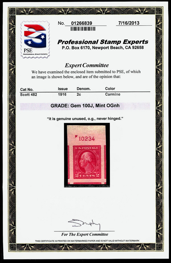 7227 nh 482 image1916, 2¢ carmine, type I, unwatermarked, imperf. (Scott 482), plate number single, o.g., never hinged, jumbo margins with small parts of 5 surrounding stamps, Superb no SMQ price for GEM 100J, with 2013 P.S.E. certificate graded GEM 100J. (Image) (Image2) (All Images)
