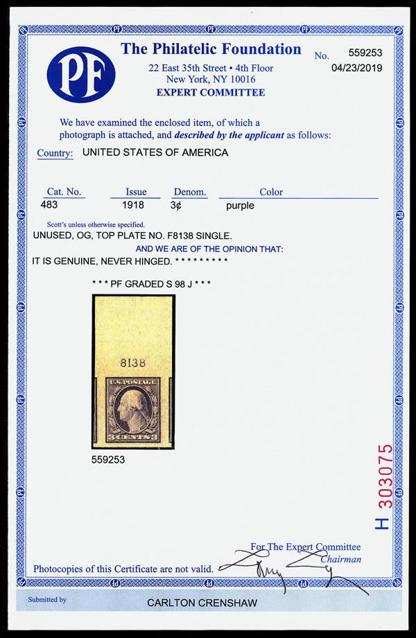 7228 nh 483 image1917, 3¢ violet, type I, unwatermarked, imperf. (Scott 483), plate number single, o.g., never hinged, jumbo margins with parts of 2 adjoining stamps, Superb no SMQ price for SUP 98J, with 2019 P.F. certificate graded SUP 98J. (Image) (Image2) (All Images)