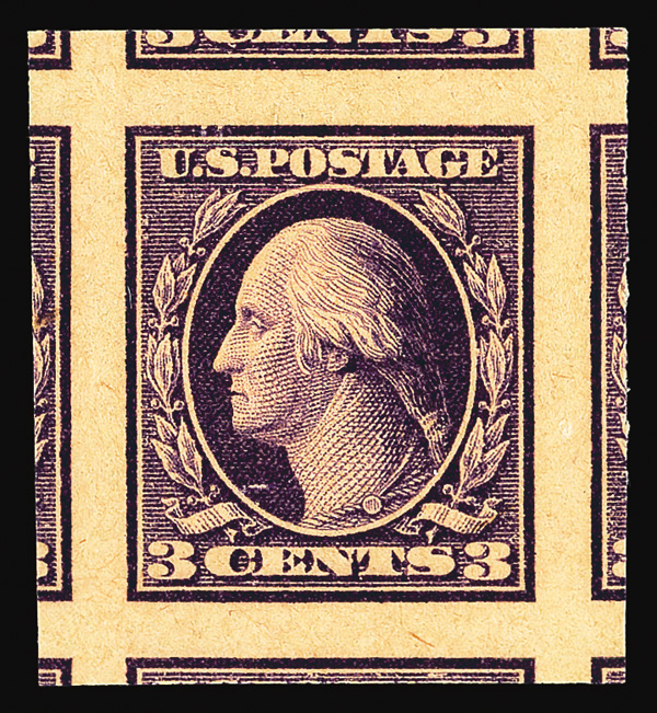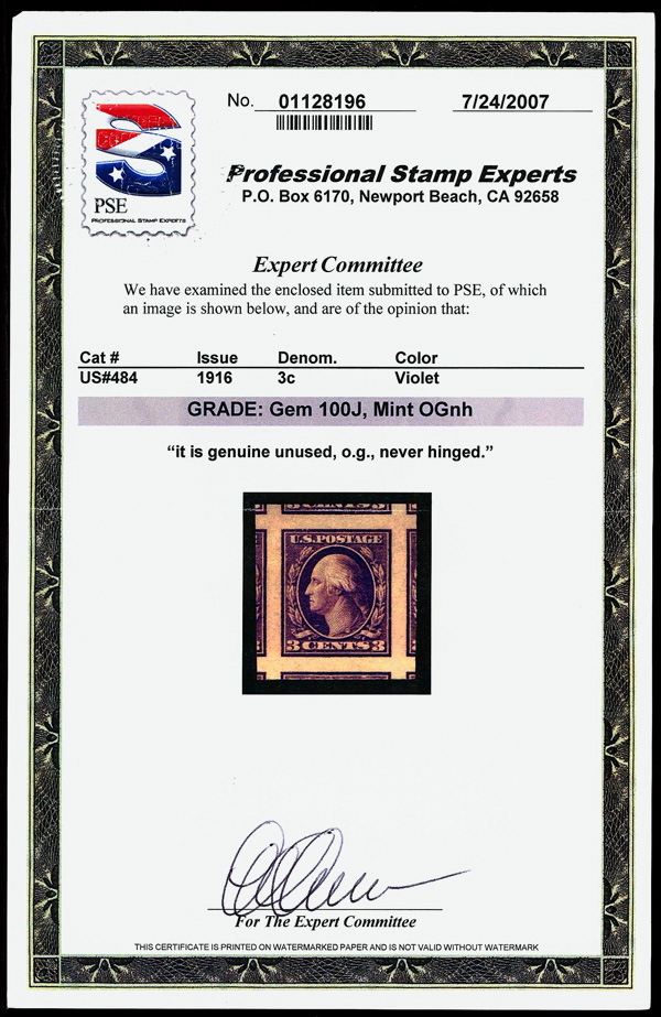 7230 nh 484 image1916, 3¢ violet, type II, unwatermarked, imperf. (Scott 484), o.g., never hinged, jumbo margins with parts of 8 surrounding stamps, Superb no SMQ price for GEM 100J, with 2007 P.S.E. certificate graded GEM 100J. (Image) (Image2) (All Images)