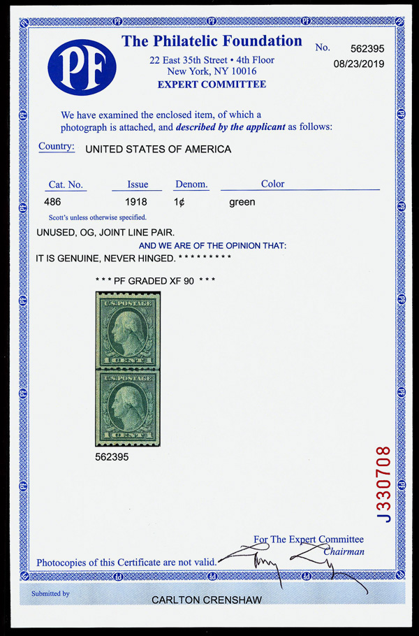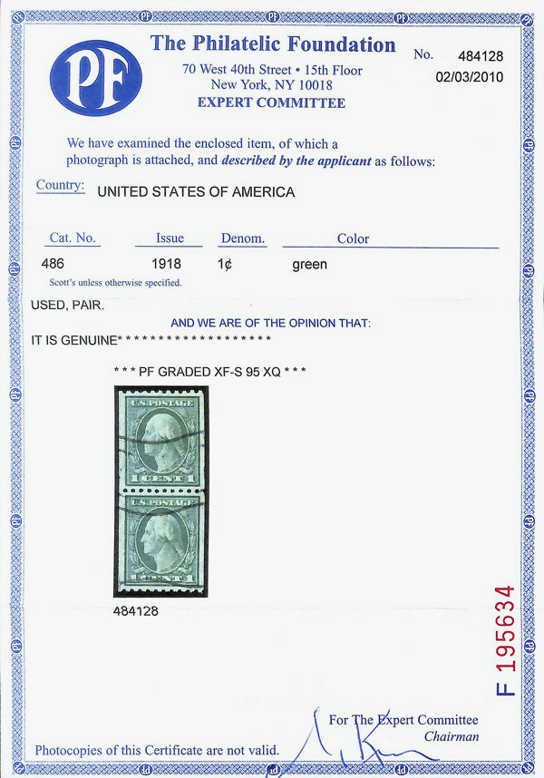 7235 O 486 image1918, 1¢ green, unwatermarked, rotary press coil, perf. 10 horizontally (Scott 486), pair, Extremely Fine to Superb, with 2010 P.F. certificate graded XF-SUP 95 XQ. (Image) (Image2) (All Images)