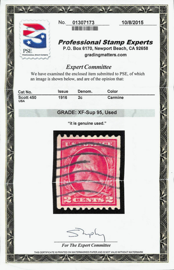 7204 O 450 image1916, 2¢ carmine, type III, S.L. watermark, rotary press coil, perf. 10 horizontally (Scott 450), Extremely Fine to Superb, with 2015 P.S.E. certificate graded XF-SUP 95.