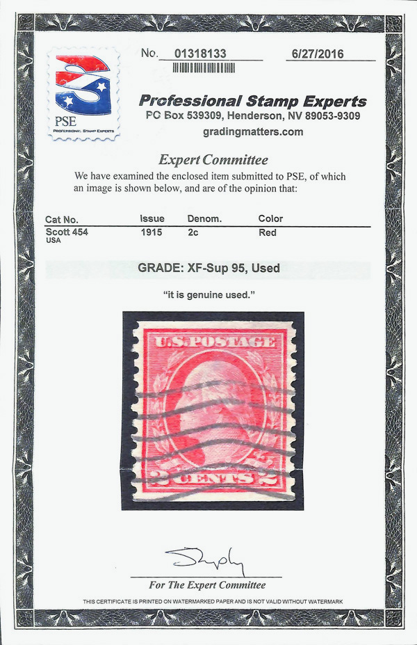 7208 O 454 image1915, 2¢ red, type II, S.L. watermark, rotary press coil, perf. 10 vertically (Scott 454), Extremely Fine to Superb, with 2016 P.S.E. certificate graded XF-SUP 95.